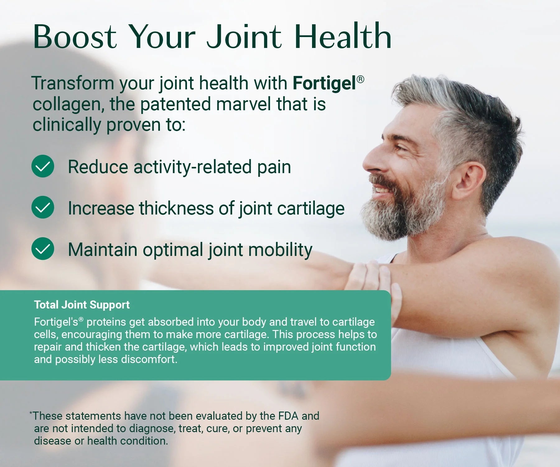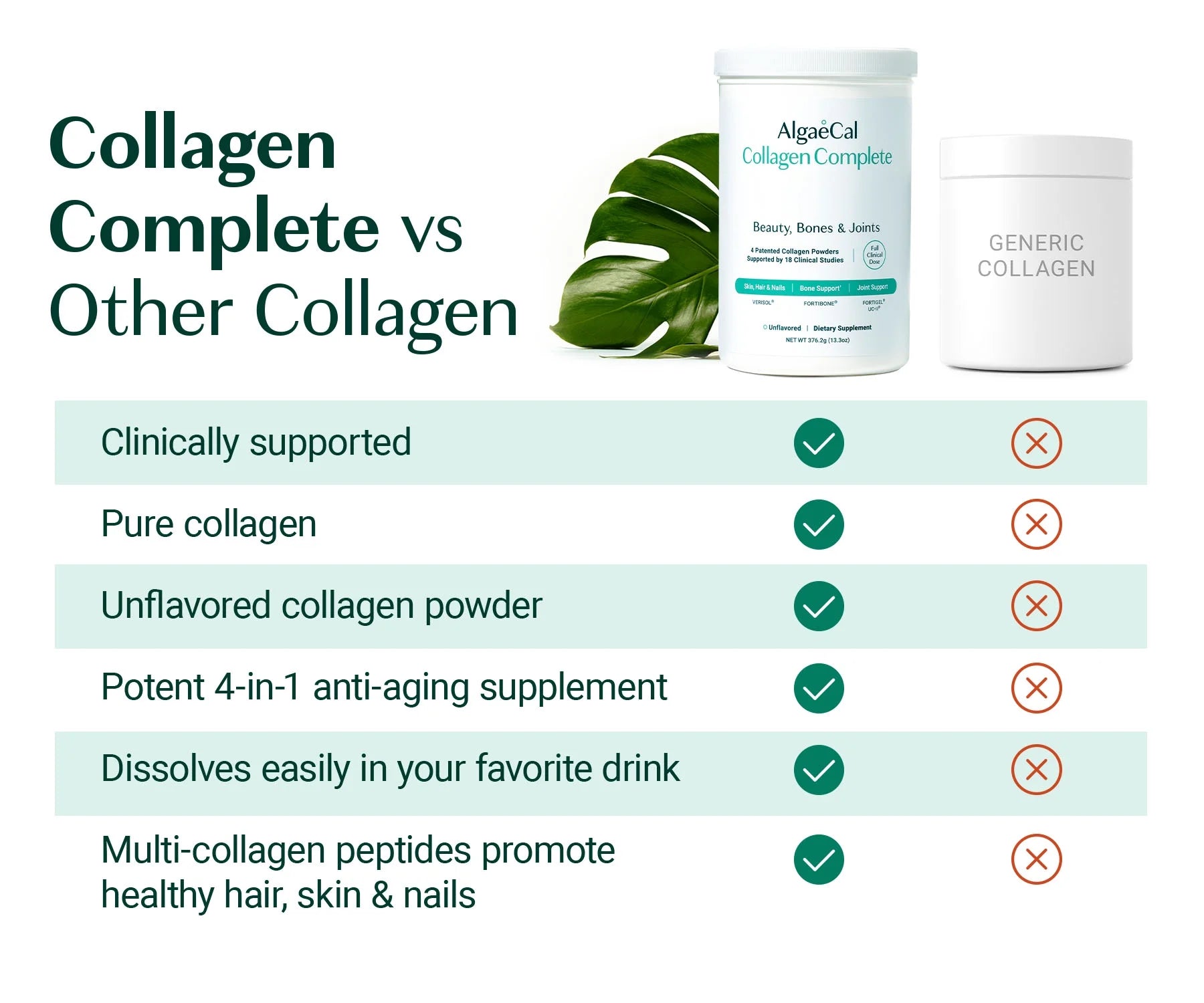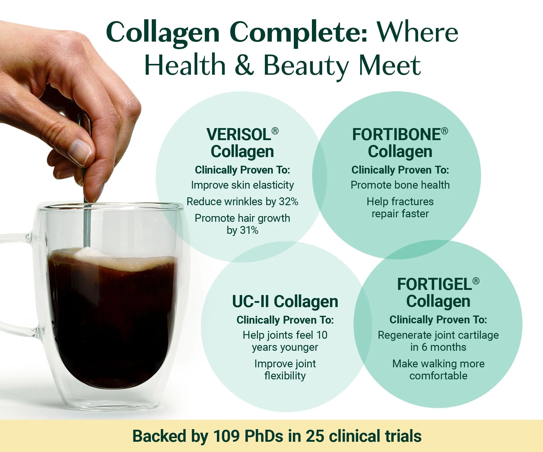 Collagen Complete helps you look and feel a decade younger. It’s all thanks to a blend of 4 patented and clinically supported collagens. These collagens are backed by 25 clinical trials to promote: - Better Joint Health: FORTIGEL® regrows knee cartilage! This extra cushioning allows you to move freely and comfortably—whether you’re walking, climbing stairs, or running. This makes it an ideal joint health supplement for anyone looking to stay active. - Fewer Wrinkles: Visibly diminish wrinkles to reveal smoother, firmer skin. Perfect for those who want a collagen supplement for a youthful appearance. - Thicker Hair: The VERISOL® collagen powder in Collagen Complete promotes hair growth. Giving you gloriously thick tresses that are sure to attract compliments. A great addition to your routine if you’re looking for hair supplements or hair growth supplements. - Improve Joint Flexibility: The UC-II® collagen peptides power in Collagen Complete makes it easier to hit your daily step goal, according to studies. It increases the range of motion in your knees – making it ideal for those needing collagen for joints or joint support supplements. - Reduce Cellulite: VERISOL® collagen powder is clinically supported to reduce the appearance of cellulite, helping you feel confident and ready to enjoy the beach! Ideal for those interested in beauty collagen to improve skin smoothness. - Strengthen Nails: Clinically supported VERISOL® collagen powder makes nails stronger and reduces breakages. This makes Collagen Complete an essential hair, skin, and nails supplement. Increase Bone Density:The FORTIBONE® collagen powder in Collagen Complete is clinically backed to increase bone density. So, if you’re worried about your bones, this bone and joint supplement is your ideal solution. Plus, Collagen Complete is totally flavorless and dissolves quickly in hot drinks. This 4-in-1 collagen powder supports a youthful appearance, joint flexibility, and strong bones, helping you look and feel your best.