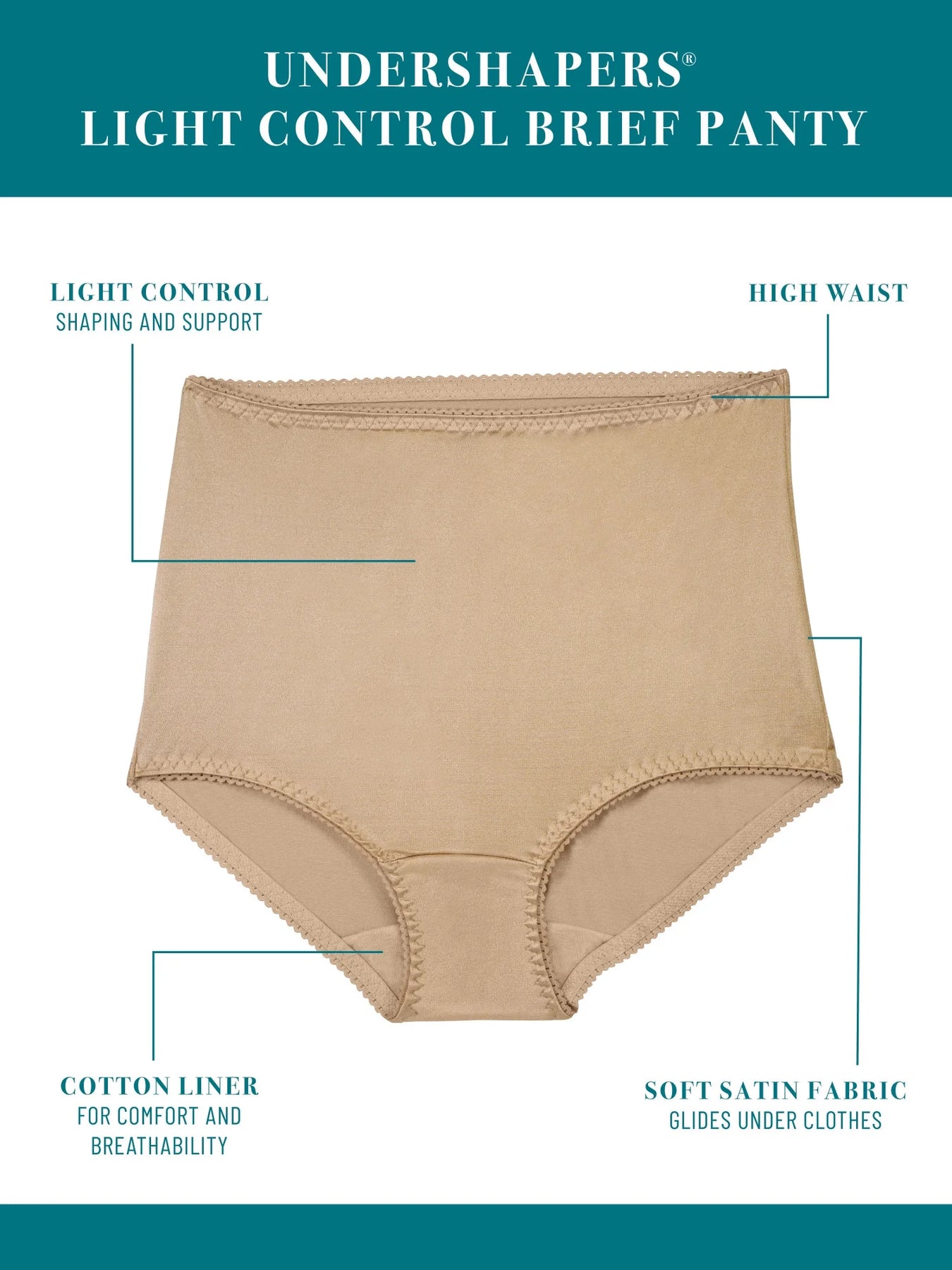 Our Vanity Fair Radiant Collection Undershapers Brief features light control and ultimate comfort making it perfect for everyday wear and smoothing. Our Undershapers Brief boasts an excellent fit that stays in place all day, creating a beautifully smooth finish under clothes. This panty features a high waist and full rear coverage for an all over smooth look. The cotton inner lining provides maximum breathability so you can feel comfortable all day. The soft satin fabric glides underneath your clothes, making it your perfect everyday panty. Our Undershapers Brief panty offers all shapes and sizes the perfect everyday lightweight control option. Look flawless and feel confident with our Vanity Fair Radiant Collection Undershapers Brief panty.